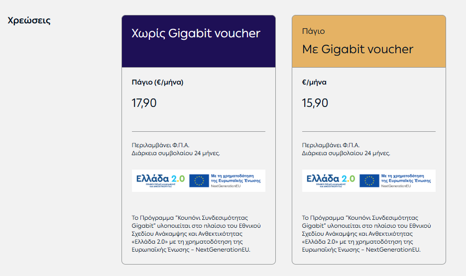 Το Πρόγραμμα «Κουπόνι Συνδεσιμότητας Gigabit» υλοποιείται στο πλαίσιο του Εθνικού Σχεδίου Ανάκαμψης και Ανθεκτικότητας «Ελλάδα 2.0» με τη χρηματοδότηση της Ευρωπαϊκής Ένωσης – NextGenerationEU. Μπορείτε να ελέγξετε εάν είστε δικαιούχος του Gigabit Voucher και να υποβάλετε τη σχετική αίτηση εδώ.